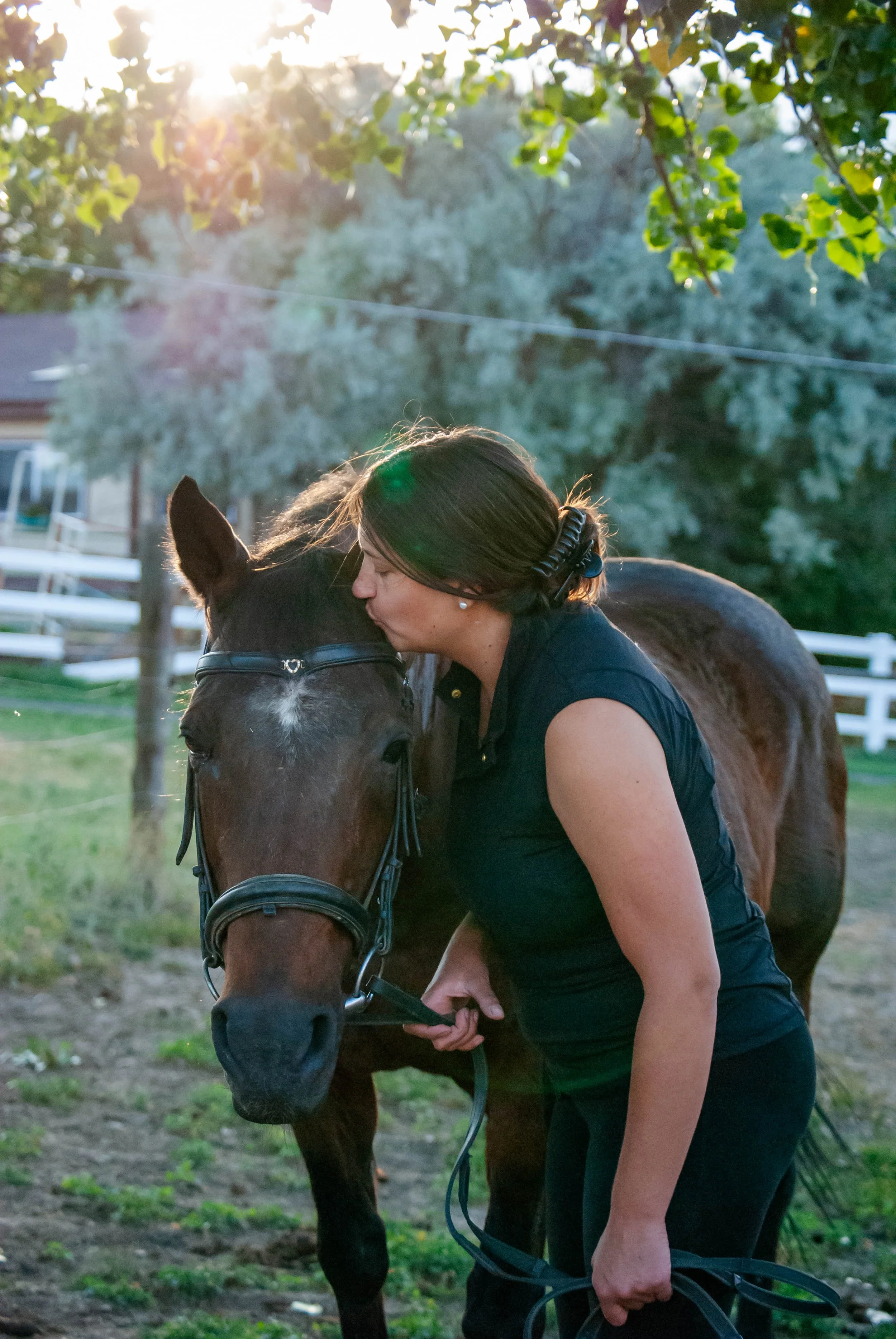 A woman with brown hair in a bun, wearing a black sleeveless top, is hugging and kissing a brown horse on the forehead outdoors during sunset.
